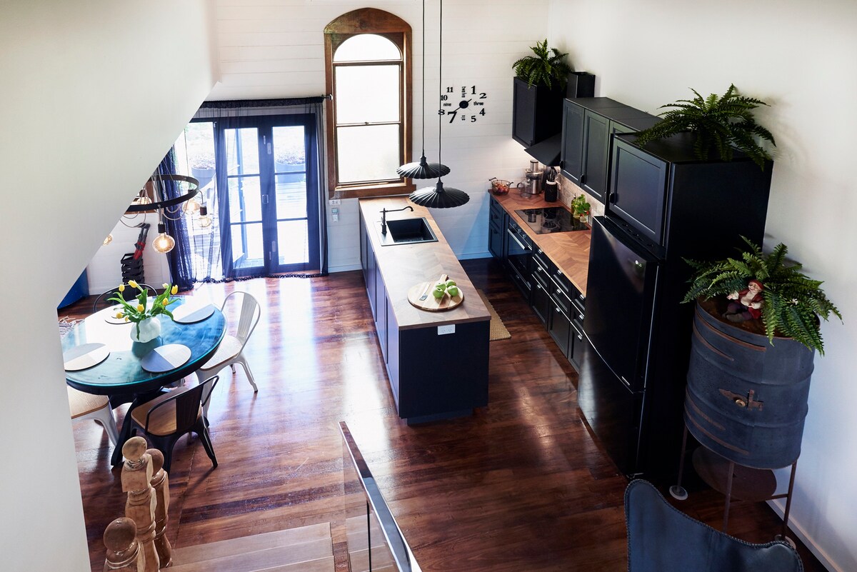 This is a comfortable self-contained studio, formerly an actual artist's studio, underneath the main residence, with its own shower and toilet, as well as a kitchenette. It has a queen bed, a king single that doubles as a sofa, and a single trundle bed. It has a small dining table and four chairs. It now boasts a camping washing machine for light loads, and an airer, as well as a dehumidifier. I also added an air fryer!