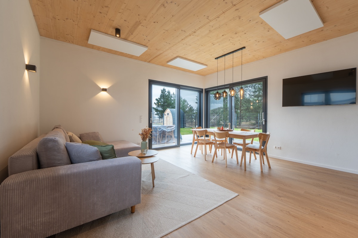Moderna casa de campo directamente en un pequeño lago. Prácticamente amueblado para relajarse durante unos días en medio de la naturaleza y para desconectarse. En la planta baja hay una cama doble grande o dos camas individuales. Se puede llegar a una escalera por el piso ligeramente inferior con otras dos camas individuales. Un baño de alta calidad y una pequeña cocina equipada con lo más necesario hacen de esta gran minicasa un lugar absolutamente bueno.
