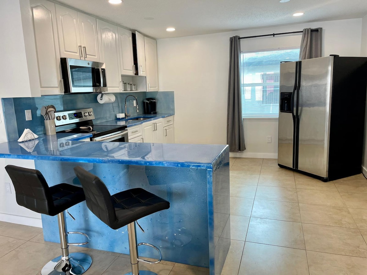 Disfruta de una comodidad de lujo y un estilo moderno a solo 10 minutos en coche de la playa. Te encantará la encimera de cocina personalizada única y 2 acogedoras camas. Hemos pensado en todo para que tu estancia sea cómoda: TV inteligente 4K de 65 pulgadas, lavadora/secadora, 2 plazas de aparcamiento dedicadas, un patio privado y una cocina totalmente equipada. Hay un escritorio de trabajo dedicado e internet de alta velocidad. Sistema de ducha de hidrojet y espejo iluminado en el baño, espejo de ambiente que cambia de color, ventanas de impacto, aire acondicionado central, salida al mediodía.