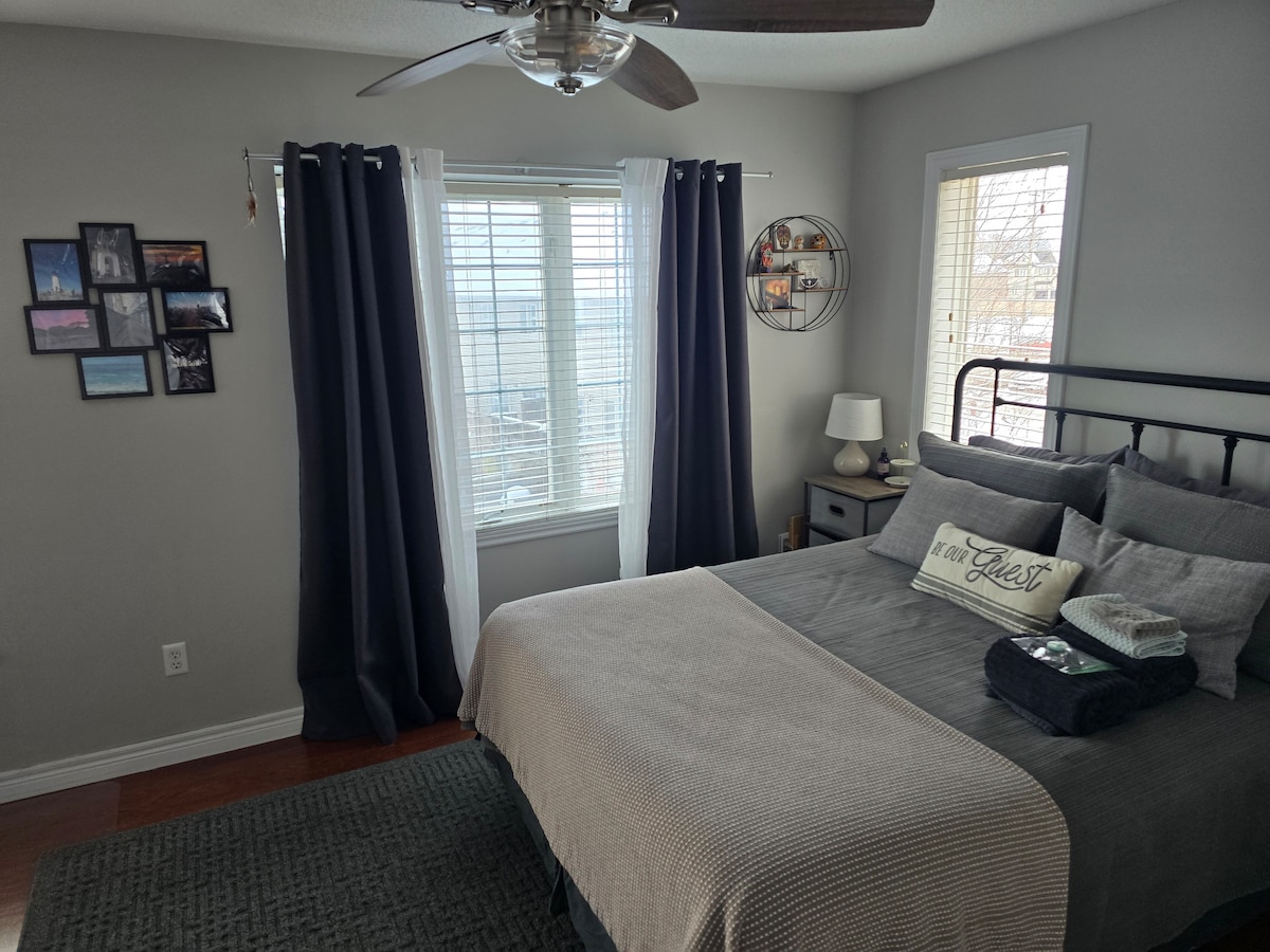 ¡Te damos la bienvenida a Shaver Estates of Ancaster! Calle tranquila y familiar dentro del complejo donde estoy hospedando mi casa adosada COMPARTIDA Relájate en tu propio dormitorio espacioso con cama tamaño queen con un televisor de 50 pulgadas montado con varios servicios de streaming, un pequeño escritorio/silla para computadora portátil, espacio en los estantes y un amplio armario para tus pertenencias. Grandes ventanas para permitir la luz solar, ventilador de techo para tu comodidad. Prepara una comida en una cocina totalmente equipada o disfruta del balcón de temporada del segundo piso o de la salida a la planta baja.