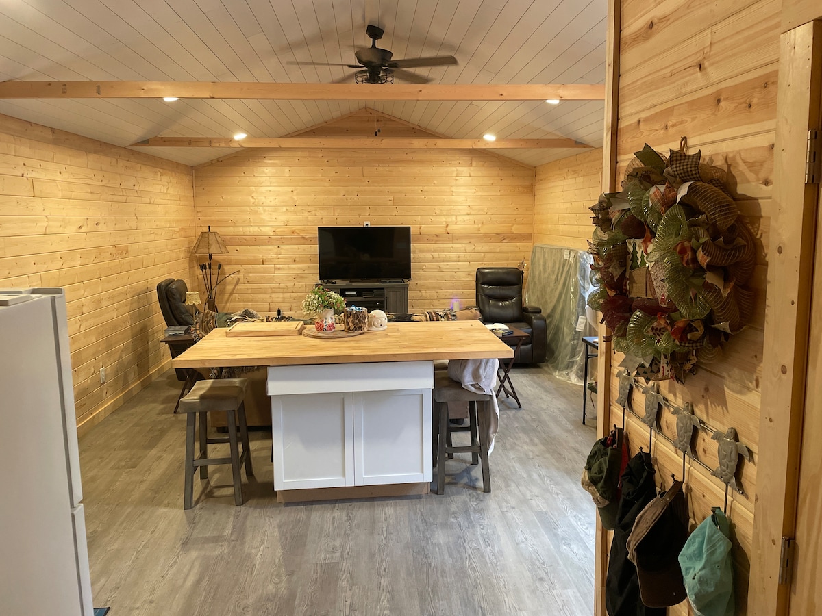 ¡Escápate a nuestra minicasa recientemente renovada en Rough River Lake! Acceso privado al lago y vistas impresionantes en 2 acres. Retiro aislado con comodidades modernas, rodeado de bosques. Perfecto equilibrio entre comodidad y naturaleza: relájate en el porche, en la chimenea o pasea hasta el agua. Tu acogedor escondite junto al lago te espera. Wifi y media cocina con todo lo necesario. Esta minicasa tiene todo lo necesario para un fin de semana inolvidable. ¡A pocos minutos de puertos deportivos, restaurantes y a una hora de Mammoth Cave!