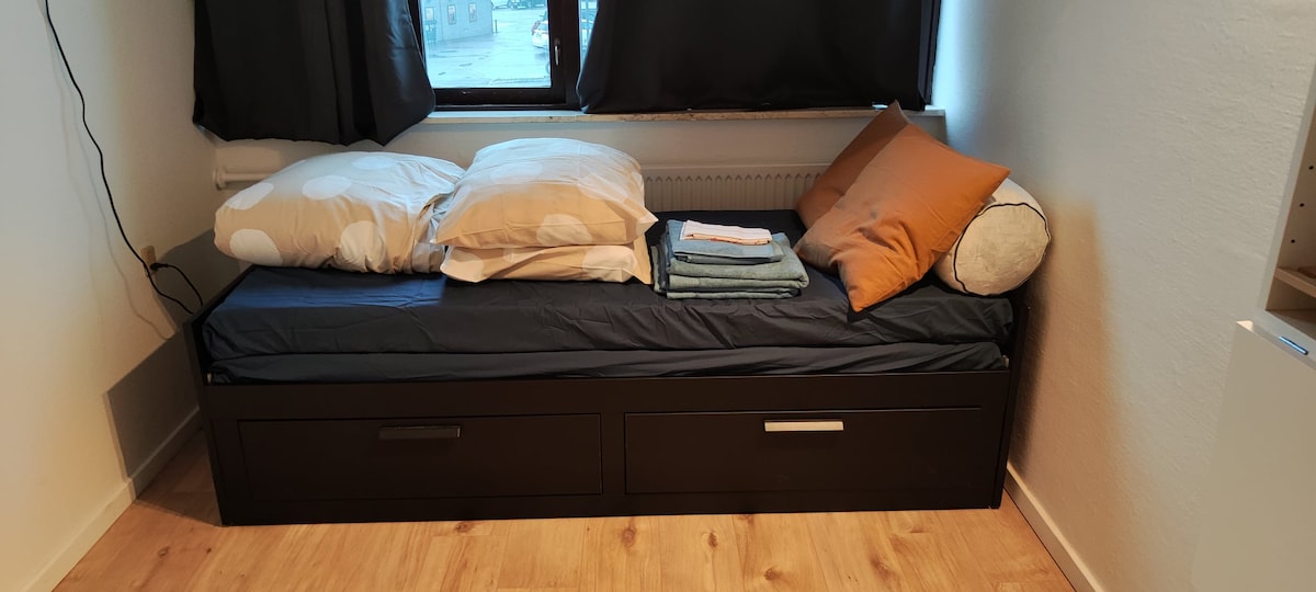 25 M2 1-room apartment with trinet kitchen and good bathroom. The bed can be unfolded to a double bed, tables can be unfolded from the wall and chairs are on the wall. Much unused closet space. The apartment is located next to Rødovre Train Station and is therefore easily available from Copenhagen Airport and the center of Copenhagen. Note, the center of Copenhagen is 15 minutes away by train. Free Guest Parking can be arranged. Perfect for commutes and couples staying for short visits.