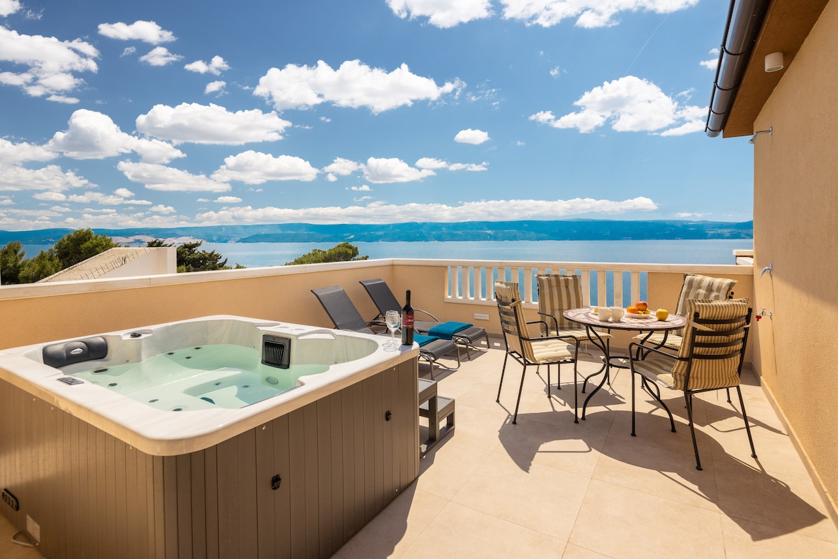 A 7 minutos a pie de la playa Ratac Makarska, el exclusivo ático Big Blue con jacuzzi privado cuenta con alojamientos con acceso a un jacuzzi. Los huéspedes pueden beneficiarse de aparcamiento privado en el lugar y wifi de cortesía. También hay asientos al aire libre disponibles en el apartamento. Con balcón y vistas al mar, el espacioso apartamento incluye 2 dormitorios, sala de estar, TV de pantalla plana, cocina equipada y 2 baños con jacuzzi y ducha. El apartamento incluye toallas y ropa de cama.