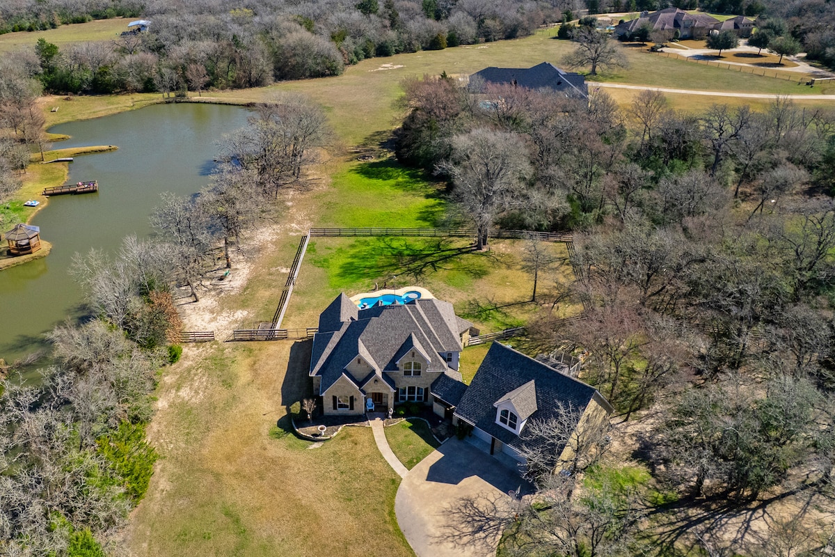 ¡Bienvenido a nuestra tranquila casa de campo! Ubicado detrás de árboles y un estanque, tiene una vista privada espectacular de 10 acres. Una decoración sencilla y acogedora te hace sentir como en casa. Disfruta de café recién hecho por la mañana en el porche, date un chapuzón en el jacuzzi, relájate junto a la hoguera y observa la puesta de sol o quédate en casa para una noche de cine en el sofá extragrande de cuero de Pottery Barn. Con Texas A&M a solo 25 minutos, no te sentirás lejos de lo mejor que el país y la vida urbana tienen para ofrecer.
