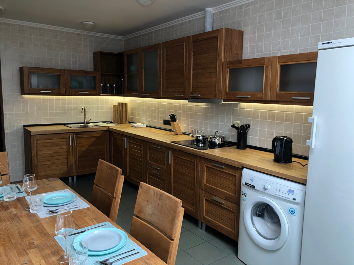 Esta casa es ideal para una familia o un grupo de 6 personas. La casa de 2 plantas tiene 3 dormitorios, un acogedor salón con chimenea y una cocina grande y luminosa, diseñada para los desayunos más estéticos en una mesa redonda. Tiene su propio patio y un rincón verde con una zona para una copa de vino por la noche o una taza de café por la mañana. Hay un lugar para aparcar el coche. Además, los huéspedes pueden disfrutar del jardín verde de los propietarios de la casa en el tiempo asignado.