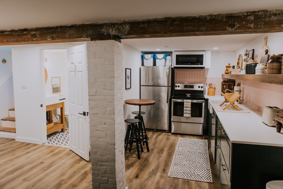 ¡Amplio sótano recién terminado con techos de 8 pies y abundante luz natural! Perfecto para una escapada romántica o para profesionales maduros por negocios. A pocos pasos de los restaurantes y tiendas de Locke Street, así como de los parques, los hospitales y el centro de Hamilton. Las características incluyen calefacción por suelo radiante, TV 4k de 55pulgadas, una cocina personalizada y lavandería. Tiene capacidad para 4 personas con cama queen en el dormitorio y colchón queen extraíble en la sala de estar. Estacionamiento gratuito en la calle y llegada autónoma en cualquier momento.
