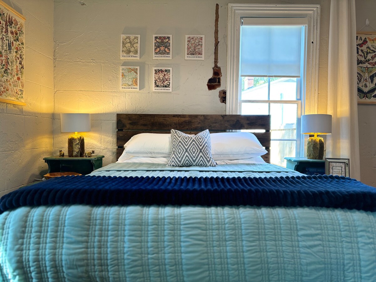 A poca distancia a pie de cervecerías, restaurantes y tiendas de Graham. Alrededor de 1920, cuenta con paredes de ladrillo originales expuestas, bañera de hidromasaje grande, mesa de billar/mesa de comedor, cocina totalmente equipada y 4 espacios para dormir tamaño queen (1 cama de aire, 1 sillón puff CordaRoy). Los amplios dormitorios, las sábanas limpias y las grandes ventanas hacen que el espacio sea luminoso y espacioso. A pocos minutos de Elon/Burlington/bodegas y cervecerías. A 28 millas del parque acuático WetNWild en GSO. El patio privado al aire libre cuenta con un horno de pizza de piedra personalizado/chimenea y un nuevo jacuzzi.