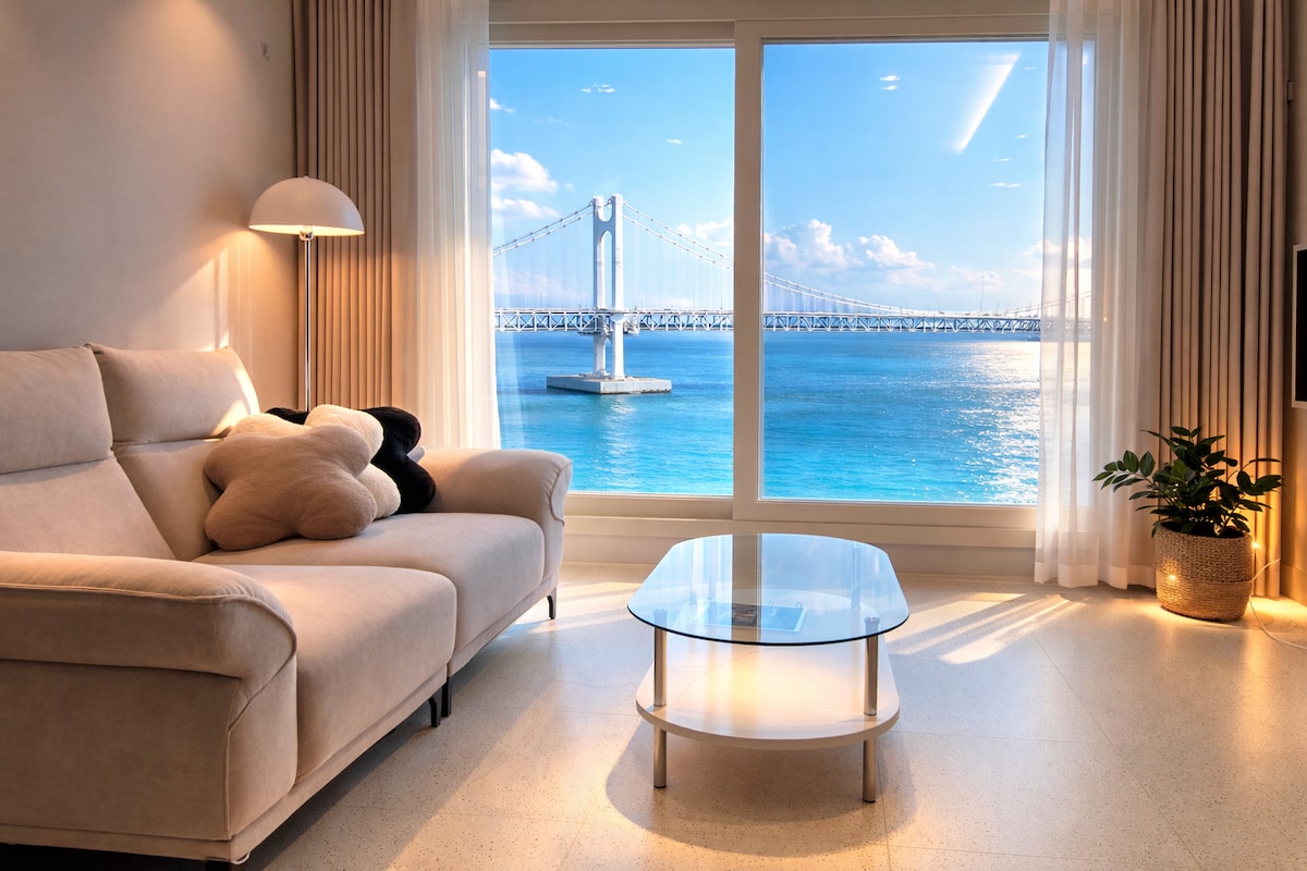 🌈 Estancia premium con vista completa al mar del puente Gwangan ¡Situado justo enfrente de la playa de Gwangalli! Este es un nuevo alojamiento premium con vista al mar donde puedes disfrutar de la vista completa al mar del puente Gwangan desde el interior de la habitación. Con un interior ordenado y refinado de clase hotelera Es un espacio con una satisfacción muy alta de los huéspedes. ✨ El mayor orgullo del alojamiento Terraza privada con vista al mar directamente desde la sala de estar. Solo hay 5 habitaciones en toda la generación. Puente Gwangan + Mar + Vista a la ciudad al mismo tiempo Disfrutarás de la extraordinaria vista. Terraza emocional con 🌴 hamaca y cama de sol Hamaca donde puedes relajarte mientras miras el mar. 2 tumbonas para relajarse Espacio emocional completo con grava blanca y tonos de madera En el momento en que te sientas en la terraza, Es una zona de fotos que solo toma una foto. 🎆 Fuegos artificiales en yate y vista nocturna del puente Gwangan Hay un espectáculo diario de fuegos artificiales en el mar frente a la casa. Acostado en una hamaca y una cama de sol La vista nocturna del puente Gwangan + el espectáculo de fuegos artificiales Esta es una experiencia única que solo este lugar tiene para ofrecer.