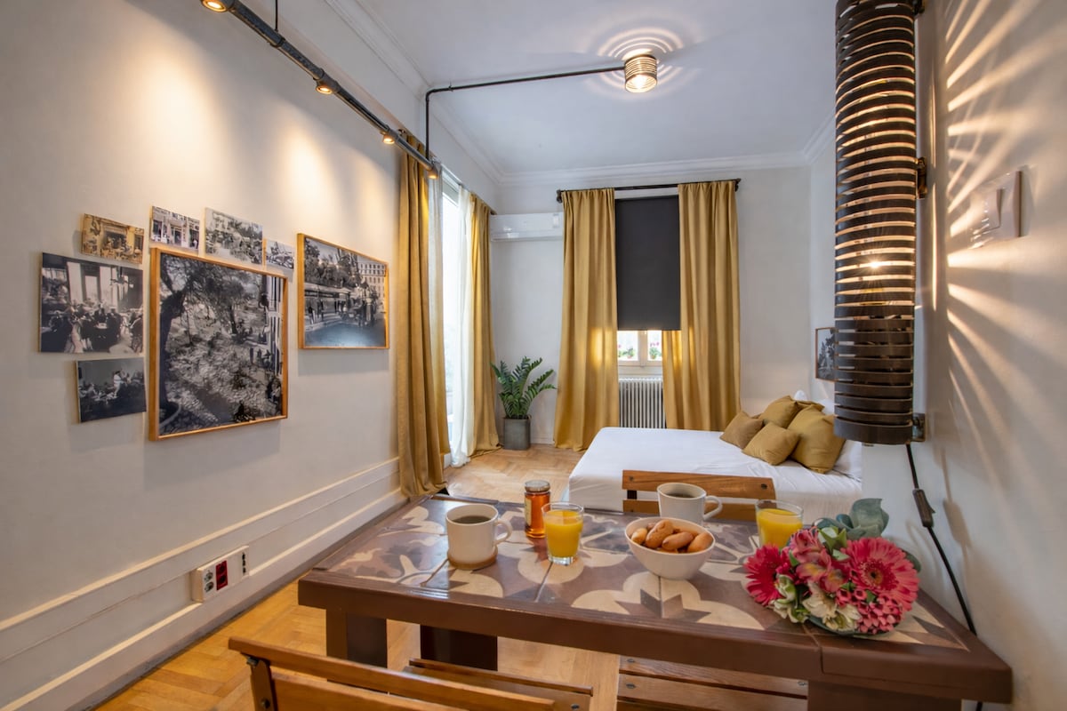 El apartamento de 80 metros cuadrados (861 pies cuadrados) fue renovado en junio de 2017. Cuenta con dos dormitorios grandes, dos baños, una amplia sala de estar y un baño más grande que la media. La cocina está equipada con todos los electrodomésticos necesarios (nevera, lavavajillas, fogones, horno microondas y tostadora). El apartamento puede alojar fácilmente a 4 personas y las familias son bienvenidas. Gracias a la renovación, nuestros huéspedes podrán disfrutar de la sensación del antiguo apartamento ateniense (grandes ventanales, suelos de madera) con las comodidades modernas. Además del apartamento, nuestros huéspedes pueden utilizar nuestra azotea, donde podrán relajarse o disfrutar de una de las comidas del día. Como hay más apartamentos disponibles en el mismo edificio en alquiler, ¡las familias o amigos que viajan juntos pueden alojarse juntos! Como se trata de un edificio de propiedad familiar, uno de nosotros estará disponible en caso de que necesites algún consejo o surja algún problema. Somos muy discretos y estamos dispuestos a ayudar a nuestros huéspedes con cualquier pregunta que puedan tener sobre el apartamento o su estancia en Atenas en general. El apartamento está situado justo detrás de la Galería Nacional y muy cerca del Museo Bizantino, uno de los lugares culturales más bellos de Atenas. Hay numerosos bares y restaurantes pequeños en la zona, mientras que Kolonaki está a 10 minutos a pie. El metro es la mejor manera de desplazarte por Atenas, pero también hay numerosas paradas de autobús muy cerca del apartamento. Si vienes en coche, ¡tenemos estacionamiento gratuito limitado para nuestros huéspedes!