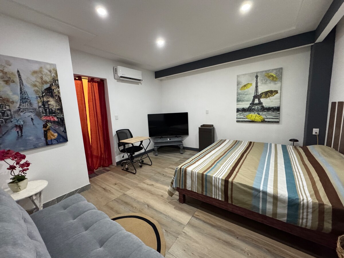 Hospédate en el corazón de Acayucan en un mini departamento práctico y acogedor, ideal para viajes de trabajo o descanso. Disfruta de una cama matrimonial cómoda, TV, clima y ventilador para tu confort. La cocina está equipada con minifrigo, cafetera, mesa y utensilios básicos, además de un sillón con mesa auxiliar, clóset y baño privado con espejo. Su ubicación céntrica te mantiene cerca de comercios, restaurantes y transporte, lo que hace tu estancia aún más práctica y agradable.