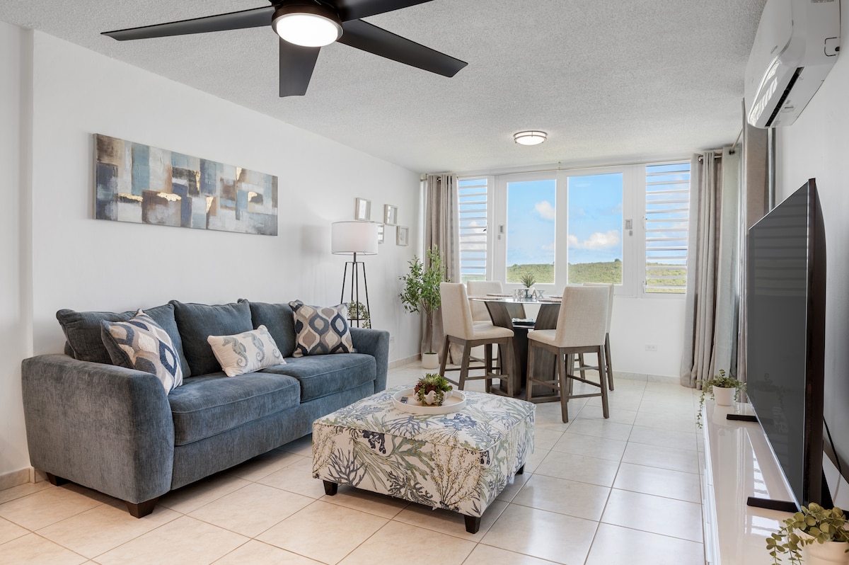 Azul Marino es nuestro espacioso dormitorio con vistas a la costa este de Puerto Rico. Ubicado dentro de un centro vacacional de 5 estrellas, tienes un campo de golf, 2 piscinas, jacuzzis y estarás cerca de las principales excursiones de Puerto Rico. Está a pocos minutos de la bahía bioluminiscente, toma un catamarán a las islas y disfruta de un día entero en la playa haciendo esnórquel o simplemente relajándote. Este apartamento tiene una cocina de tamaño completo, una enorme sala de estar y una cama tamaño king muy cómoda en el dormitorio.