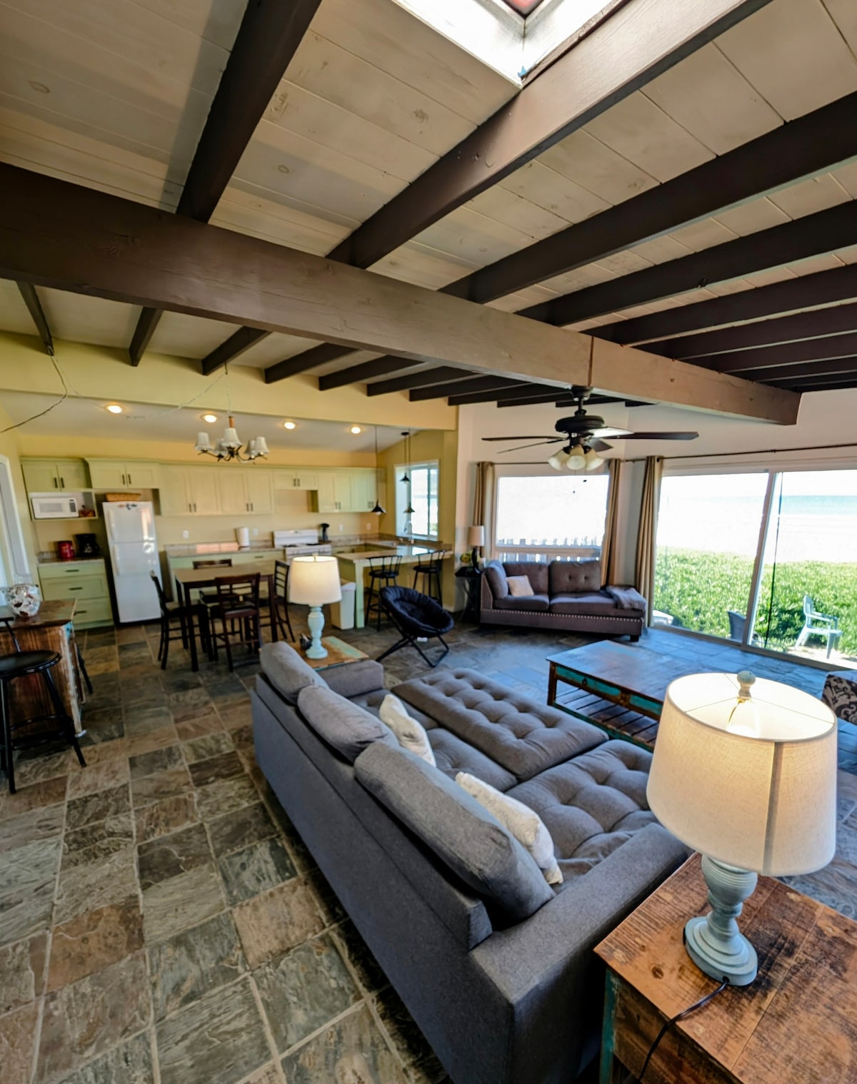 Relájate dentro y fuera con este espacio tranquilo y con estilo. Ya sea la cocina luminosa y alegre...todo equipado y listo para ti, o la gran sala que permite impresionantes vistas al mar y a las montañas de la hermosa playa de Punta Banda de seis millas. Toda la casa ha sido recientemente renovada con todos los electrodomésticos, accesorios y ropa de cama nuevos. ¡Dos dormitorios más huéspedes adicionales no son un problema, ya que el sofá se pliega y también es un futón plegable! Puedes dormir hasta las ocho. Wifi rápido, una chimenea y una gran terraza para ti