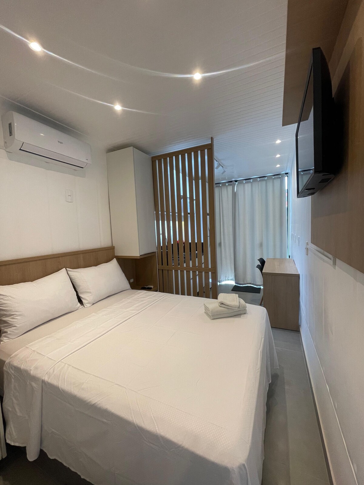 Permítase desacelerar con comodidad, en un ambiente moderno y minimalista en contacto con la naturaleza. Aislamiento seguro y ambiente limpio de covid-19 y otros microorganismos (alcohol 70% y Lysoform utilizados en todos los artículos) Los pájaros de Florianópolis suelen visitar el balcón, avisando que es hora de tomar café e ir caminando hasta la playa (a 400 metros del mar), aire acondicionado, mini cocina, microondas, minibar, TV con Netflix, balcón privado, garaje. Barrio seguro y familiar, bien ubicado.