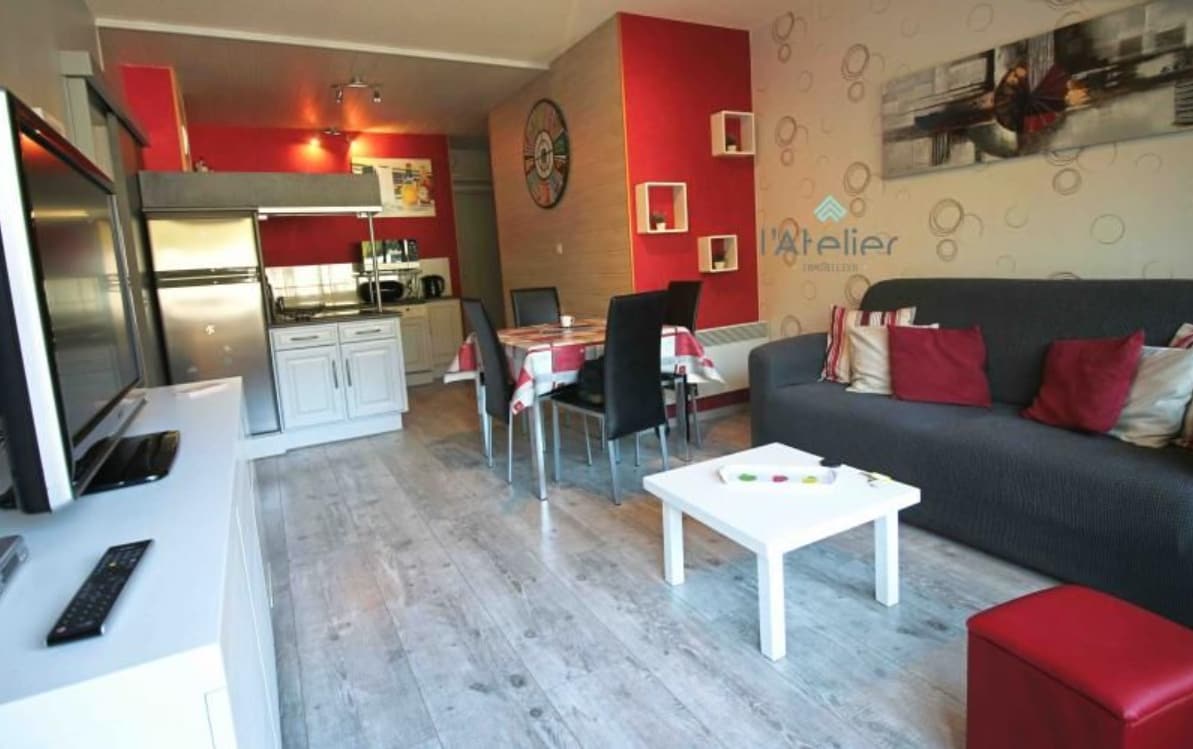 Muy bonito apartamento T2 de 29 m², en la planta baja en una residencia tranquila de un callejón sin salida en el centro del pueblo. Orientación sureste. Todo confort. Completamente reformado, clasificado con 3*. 4 personas: Dormitorio: cama de 140 Sala de estar: literas + sofá cama. TV de 80 cm, horno/microondas/grill, raclette, lavavajillas, nevera de 180 l, placas de inducción, ducha italiana, inodoro independiente, radiadores radiantes y toallero eléctrico. No fumadores. No mascotas. Aparcamiento. Terraza. Armario de esquís.