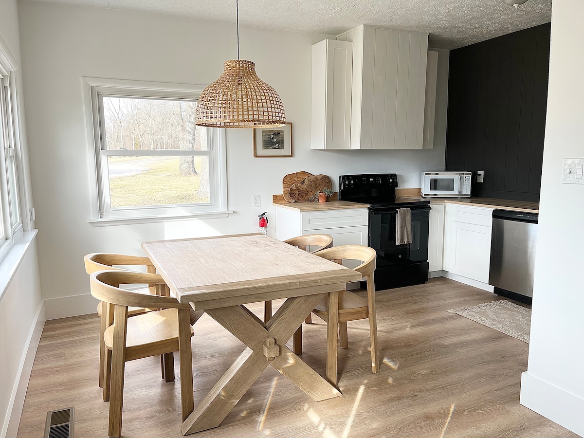 Nuevo para 2024/2025... muebles actualizados con sofá cama de espuma viscoelástica, camas tamaño king y queen de espuma viscoelástica, colchón doble adicional para el piso para opciones adicionales para dormir. ¡Área de conversación al aire libre! Casa de carruajes luminosa y espaciosa, ubicada detrás de la casa principal en 3 acres en Lebanon, Ohio. Cerca del centro de la ciudad de Lebanon, Springboro, Waynesville y a poca distancia en auto de Kings Island. -Kings Island a 11 millas. - Parque deportivo del condado de Warren 7 millas. -Roberts Center Wilmington a 20 millas. -Caesar Creek State Park 10 millas