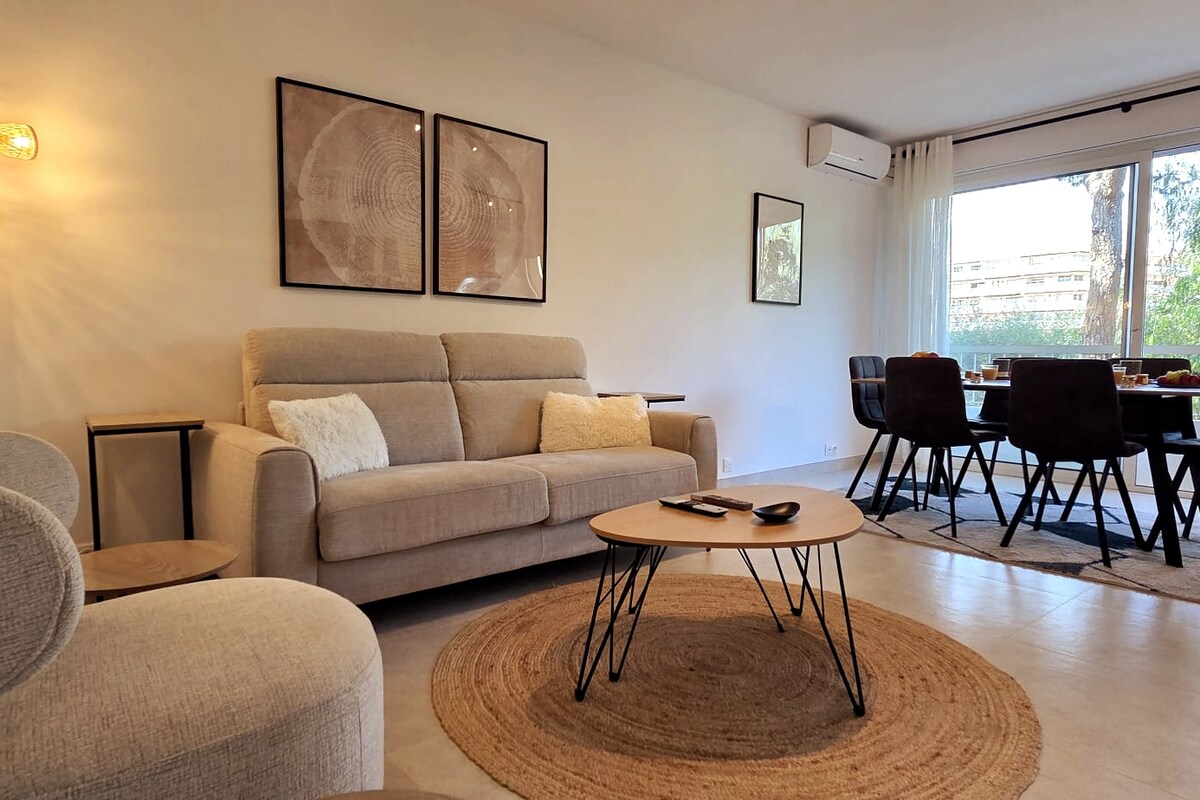 A 5 minutos a pie de la playa y de las tiendas. Disfruta de una estancia cómoda y relajada en este hermoso apartamento de 47 metros cuadrados en Cagnes-sur-Mer. Aquí se pueden alojar hasta 4 personas. Tienes un dormitorio con cama doble y aire acondicionado, y un sofá cama muy bueno en el salón. Tienes todas las comodidades necesarias: sábanas, toallas, jabón, café, té, etc. Si vienes con coche, tendrás una plaza de aparcamiento gratuita en la residencia.