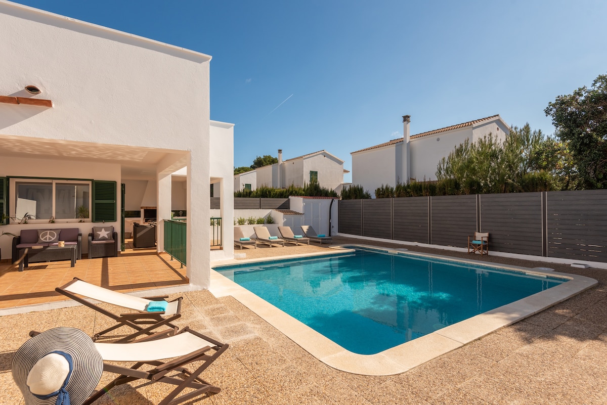 Moderna villa con piscina situada en Macaret, una de las zonas con más encanto paisajístico de Menorca, un lugar inigualable que invita a la desconección total. Es una urbanización muy autentica y nada turística: la villa al estar situada al final de la urbanización, apenas tiene vecinos. Tranquilidad está garantizada. La villa disfruta de inigualables vistas; desde las terrazas se puede apreciar maravillosas puestas del sol. Delante de la casa, a través de las rocas se puede acceder al mar.