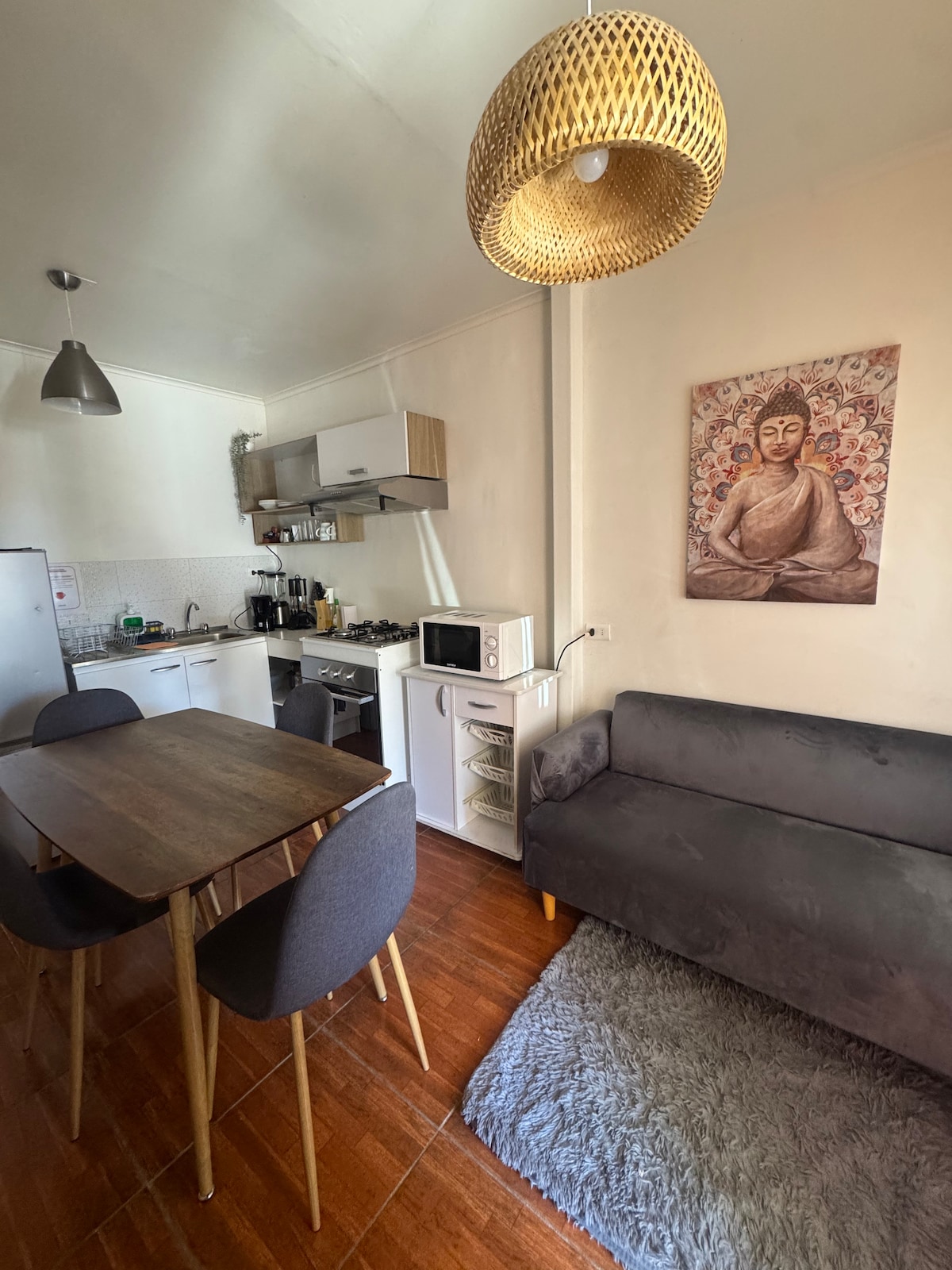 Hermoso departamento en condominio, seguro y tranquilo, perfecto para un buen descanso, cuenta con terraza y áreas verdes, estacionamiento y todas las comodidades, cercano a farmacias, restaurantes, supermercados y del centro de la ciudad. 100% equipado, con WiFi y tv cable, cocina totalmente equipada. Locomoción colectiva a la puerta del condominio.