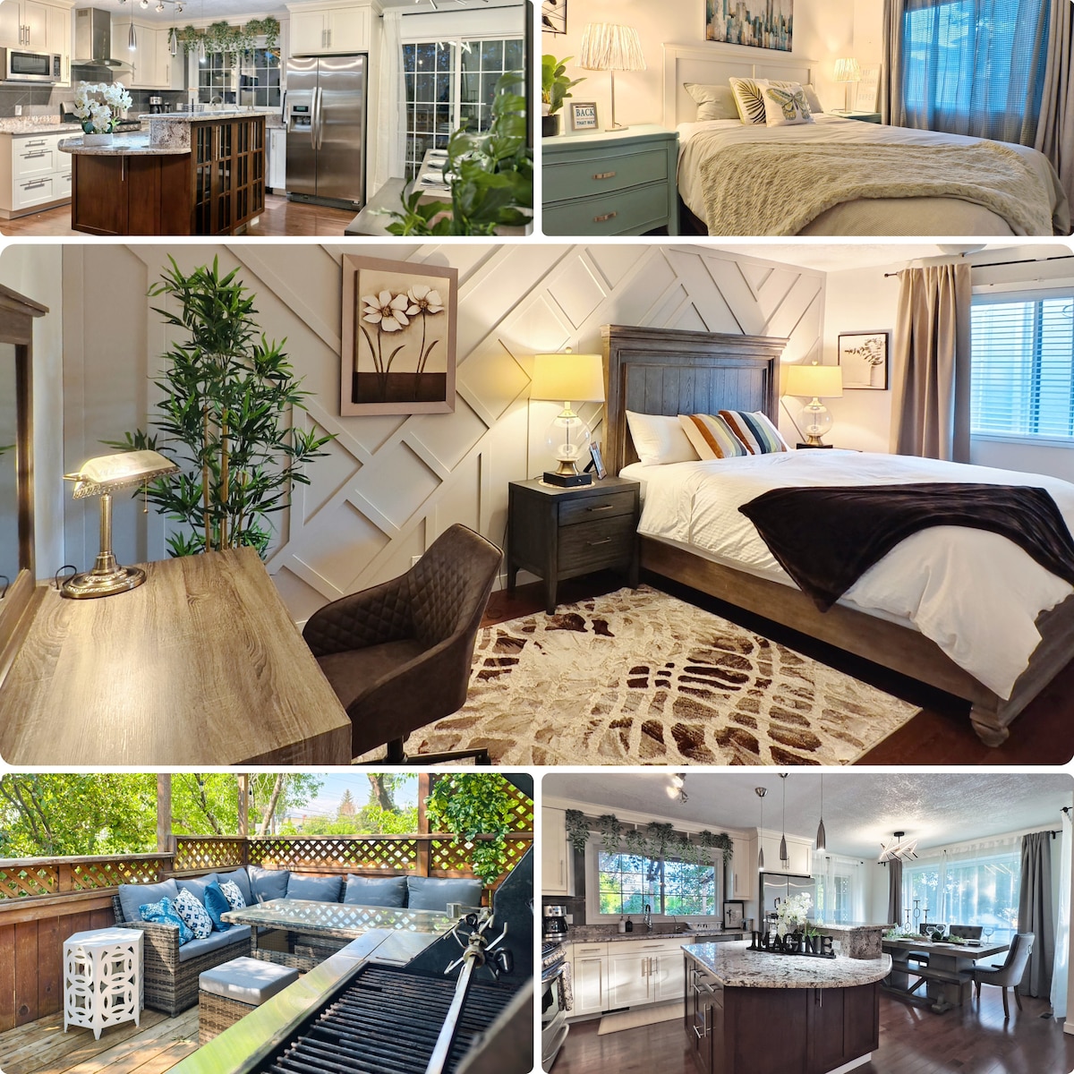 ¡Lujo de 5 estrellas con aire acondicionado a minutos del centro de la ciudad, a minutos del centro! Disfruta de una suite tamaño king, wifi rápido de 1G y estacionamiento gratuito en el garaje. Reúnete en la cocina Bosch del chef, transmite películas en televisores gemelos de 55 pulgadas o relájate con la familia junto a la mesa de fuego y la parrilla del patio trasero. La propiedad cuenta con una cama tamaño king, 2 camas tamaño queen y 2 camas individuales, por lo que es ideal para grupos grandes. Bar Nespresso Patio con luces Edison Lavandería en la suite Camina a las tiendas de Marda Loop o conduce 3 minutos a la diversión de la 17ª Avenida. ¡Nosotros ponemos el vino junto al fuego!