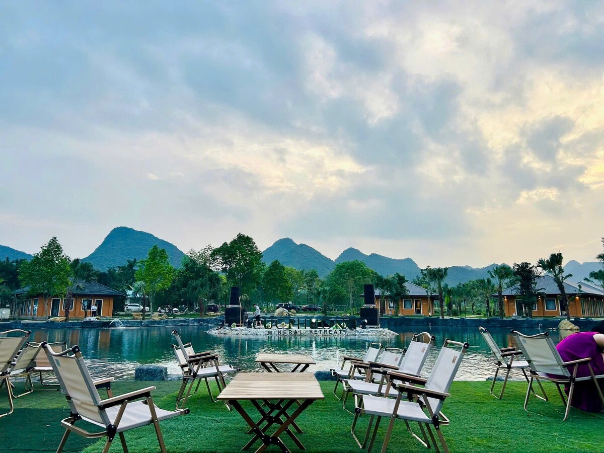 Thanh Xuan Garden Villa offers a luxury retreat set in the natural beauty of Cuc Phuong. This modern villa features three lake-view sides with a stream running through the garden, five spacious bedrooms with large glass windows and elegant bathtubs, and a private 150 m² pool. A 2000 m² garden provides space for dinners, BBQs, or boutique events. Guests enjoy free access to hot and cold mineral pools, premium sports areas, and resort bicycles. Ideal for private, peaceful retreats great escape!