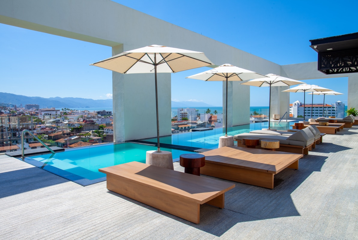 Florelle · Your private sanctuary in Mexico’s Puerto Vallarta · Restorative, indulgent hideaway for peace, privacy and pleasure · 5 blocks to Camarones Beach · 1.3 km to the Malecon Boardwalk · Private dipping pool · Rooftop infinity pool + deck with ocean views · Private patio with lush green wall + waterfall · King bed + sofa bed (sleeps 4) · Drop-down TVs in both bedroom + living room · Glass door for bedroom privacy · Steam room · Gym · Thoughtfully designed · Inquire about long-term stays