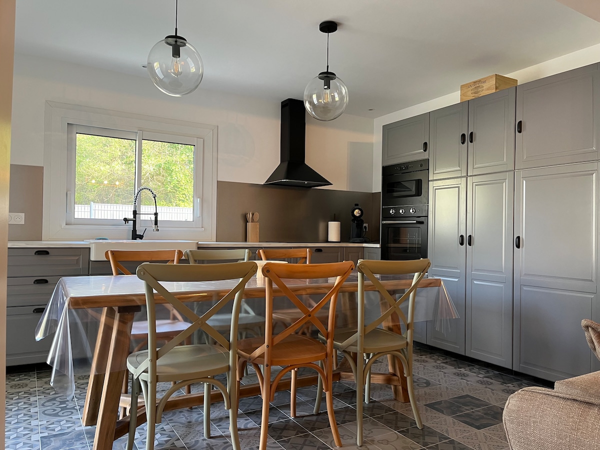 Casa de arquitecto situada a 15 min de Burdeos. La vivienda dispone de: - 3 habitaciones dobles, una de ellas con su propia sala de ducha - 1 baño separado - 2 aseos separados - 1 sala de TV de 27m2 con dos camas individuales y cortinas opacas - 1 cocina abierta al comedor - 1 salón que da a la piscina y su terraza de 120m2 El jardín privado de 2000m2 está completamente vallado sin tornillo La casa es muy tranquila ya que se encuentra al final de un callejón de 70 m