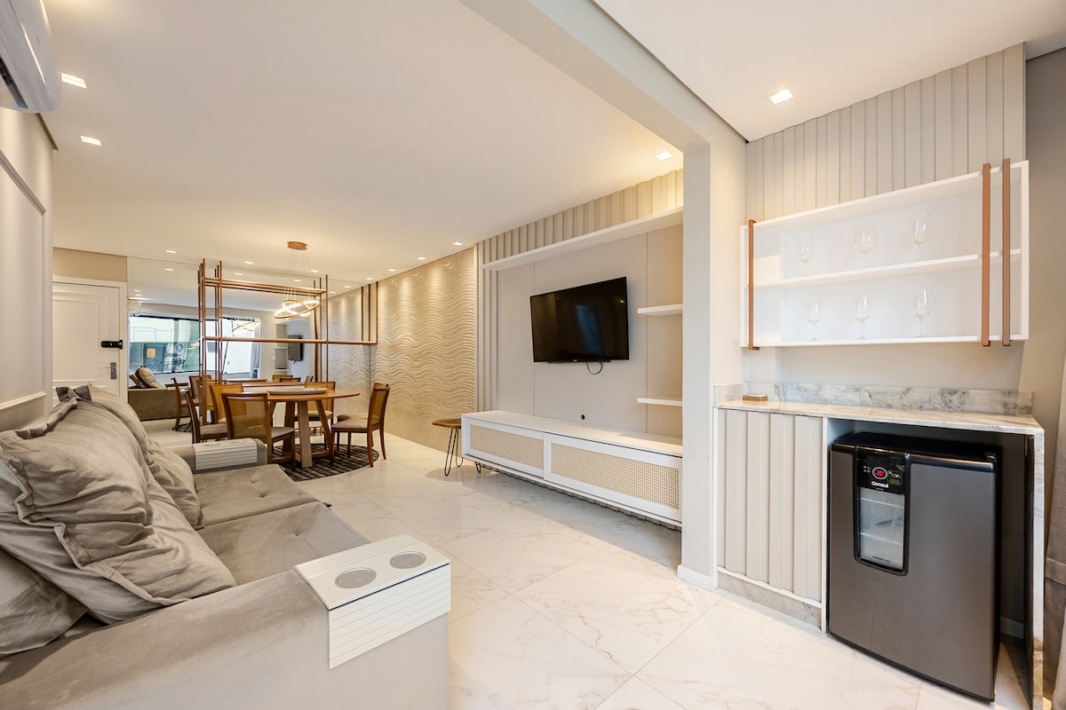Diviértase con toda la familia y amigos en este lugar lleno de estilo. Apartamento cuidadosamente diseñado con diseño arquitectónico y luminotécnico para su mejor comodidad y días increíbles. El espacio fue pensado y creado para que tenga la comodidad y todos los elementos necesarios para una estancia perfecta, ya sea de vacaciones, descanso o trabajo para que se sienta como en casa. Situado en Barra Sul, uno de los más populares y concurridos de la ciudad, también conocido como el «Dubái brasileño». .
