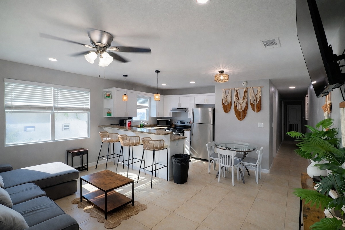 Unwind with family, friends, or loved ones at this serene and stylish getaway featuring two private balconies - one upstairs and one downstairs - overlooking a tranquil resca (natural lake). Enjoy your morning coffee or an evening breeze while watching the water and local wildlife. Just a 10 min walk from the University of Texas Rio Grande Valley and historic downtown Brownsville, this cozy retreat blends natural beauty with perfect convenience for work, study, or relaxation.
