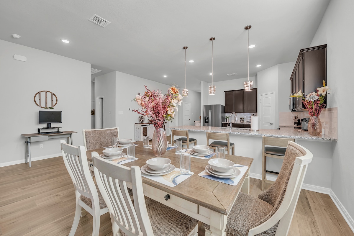 Welcome to our brand-new 3-bed, 2-bath house perfect for 8 guests! Located near the bustling Baylor Scott & White medical district and Temple College, our modern and stylish home offers comfort and convenience. Enjoy spacious rooms, well-equipped kitchen, and easy access to local attractions. Less than 10 minutes fro Lions Junction Water Park and walking trails. Enjoy shopping and dining just around the corner with countryside views in your backyard. Book now for an unforgettable stay!
