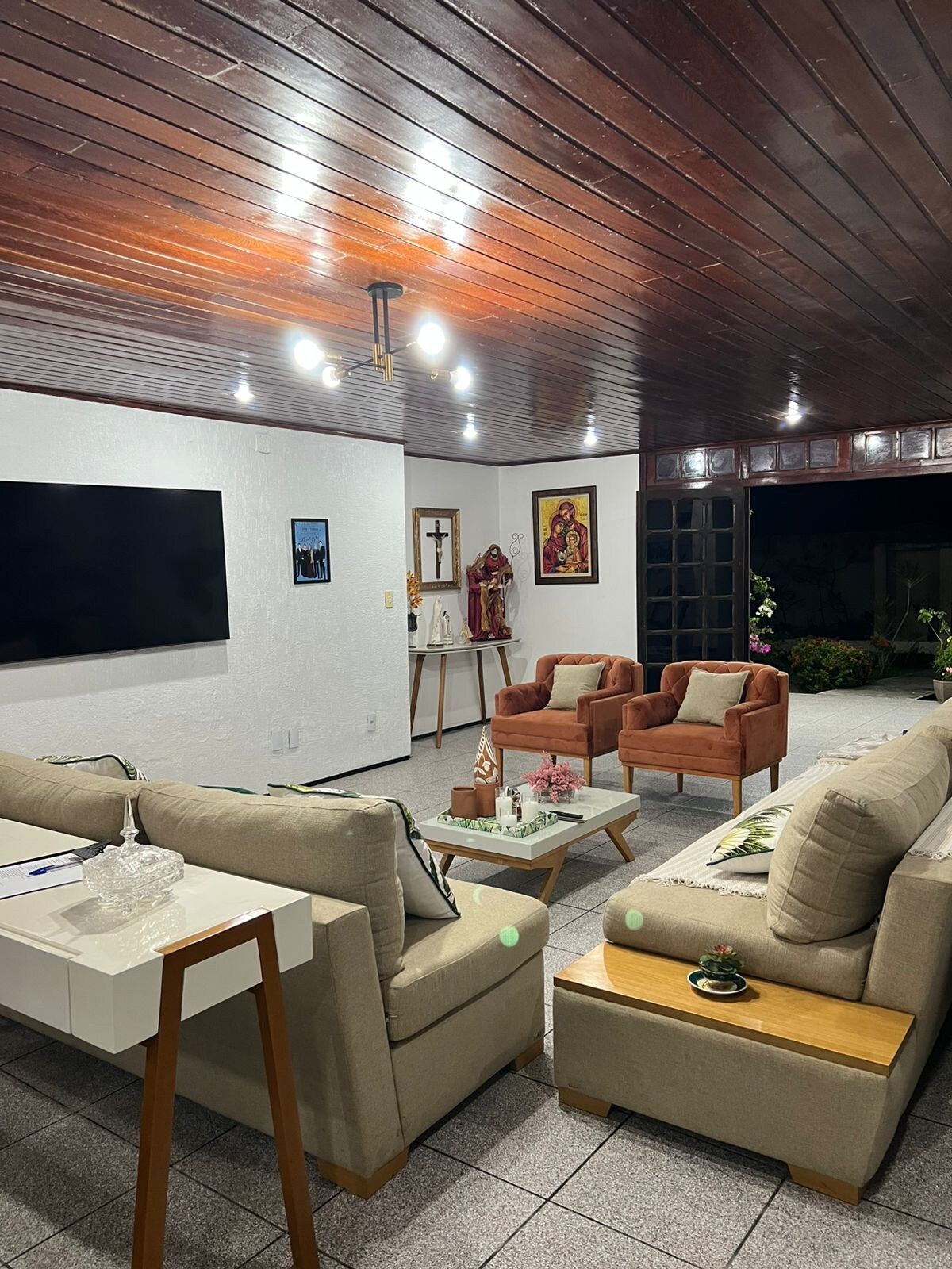 Casa grande con jardín. Cuatro dormitorios (tres suites), además de una dependencia. Las tres suites y el dormitorio/oficina en la planta baja tienen aire acondicionado. Cocina completa equipada con nevera, microondas, freidora, licuadora y utensilios. Amplia sala de estar y comedor. Terraza con fregadero y estufa, así como mesas y sillas. Estacionamiento cubierto en la terraza para dos autos, además de espacio no cubierto para varios vehículos. Alojamiento ideal para una estancia familiar.
