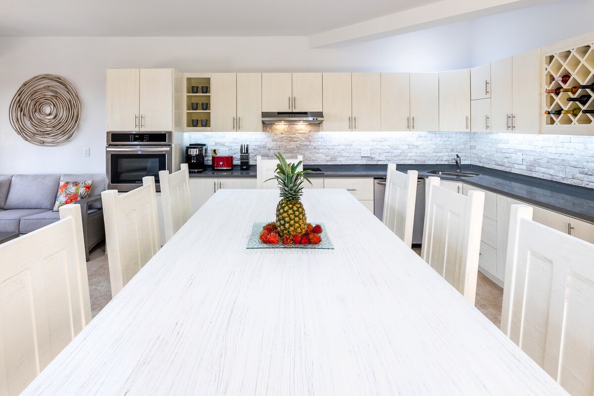 Casa de lujo ubicada en el lado norte de la isla con impresionantes vistas al mar desde todas las habitaciones, mucha luz natural y acceso a una playa privada. Acomódate y sal al patio, que está amueblado con muebles perfectos para la puesta de sol. La piscina infinita te atrae con una increíble vista panorámica del océano, colinas onduladas y el campo de golf The Black Pearl. Cada huésped puede disfrutar de la comodidad y privacidad de un baño en suite en cada dormitorio. Wifi gratuito, cable y llegada autónoma.
