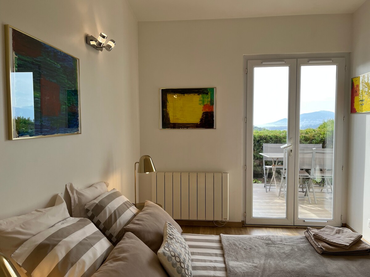 Charmant studio climatisé, terrasse et jardin avec une très belle vue à proximité d'Ajaccio, des plages idéalement situé pour visiter le golfe et ses environs ainsi que la Corse du Sud. Accès au studio par des escaliers. Place de stationnement privative gratuite.