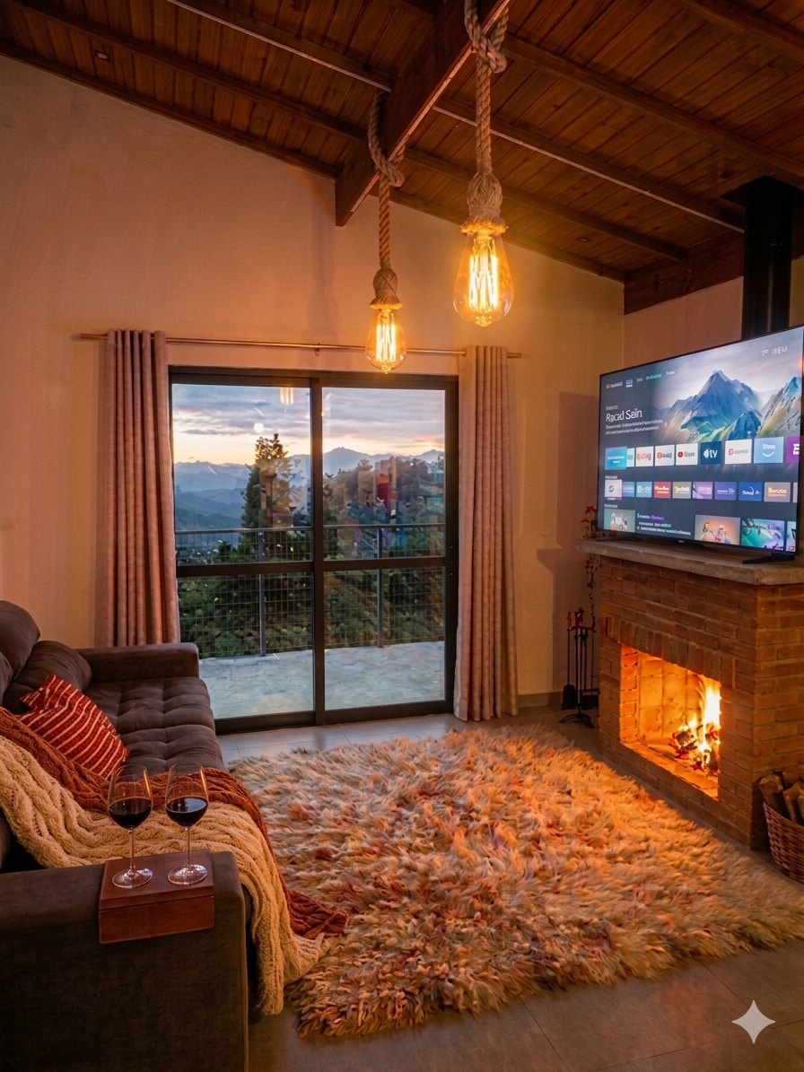 Vista divina a las montañas al atardecer + chimenea