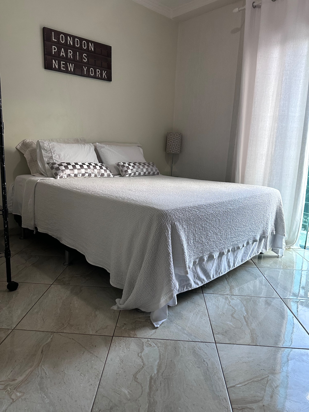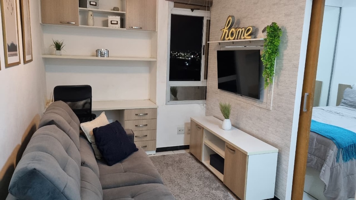 Belo apartamento em condomínio com sauna, piscina, academia, sala de jogos e sala para trabalho! O apartamento é dividido em dois ambientes e conta com: ar condicionado, cama de casal queen size, smart tv, sofá-cama, geladeira, microondas e fogão de duas bocas. Serão disponibilizadas roupas de cama e banho, shampoo e condicionador, sabonete e cápsulas de café de cortesia! O condomínio fica a 10 minutos de distância do aeroporto e do centro da cidade e possui lazer completo.