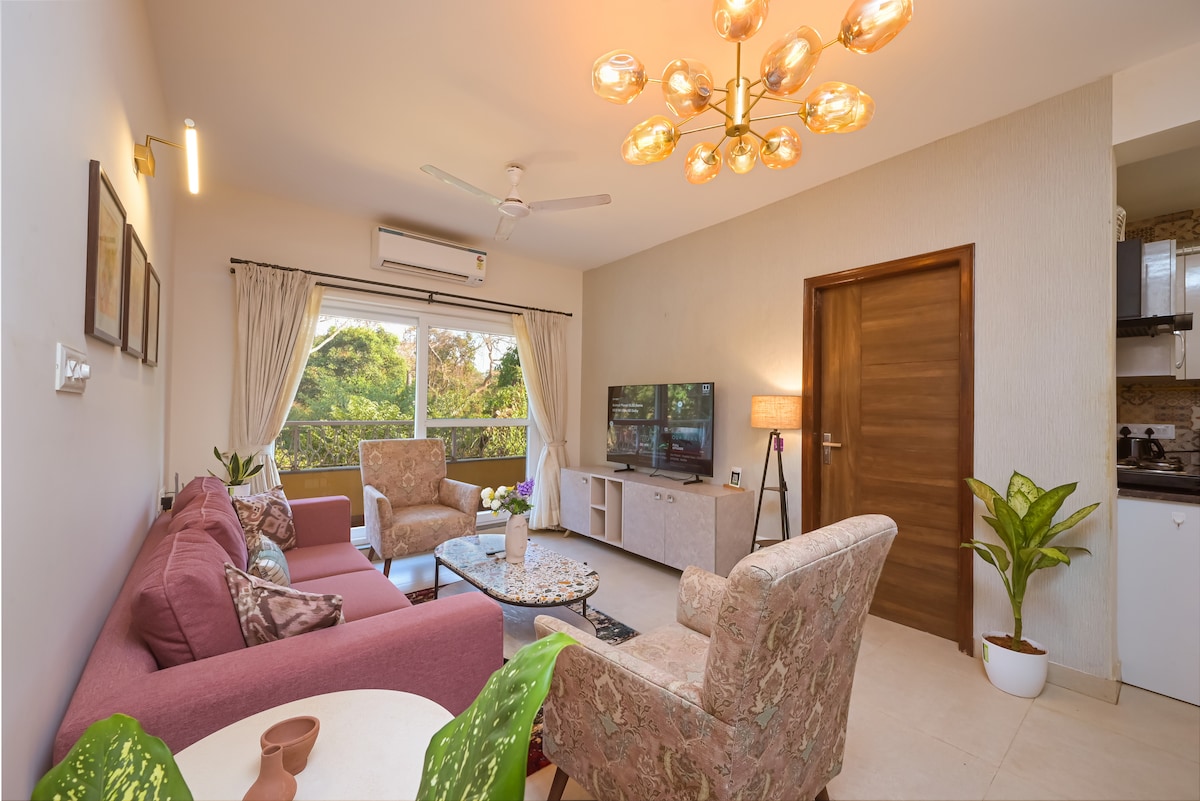 Escapada de lujo junto a la piscina: Premium 1BHK, a 5 minutos de la playa