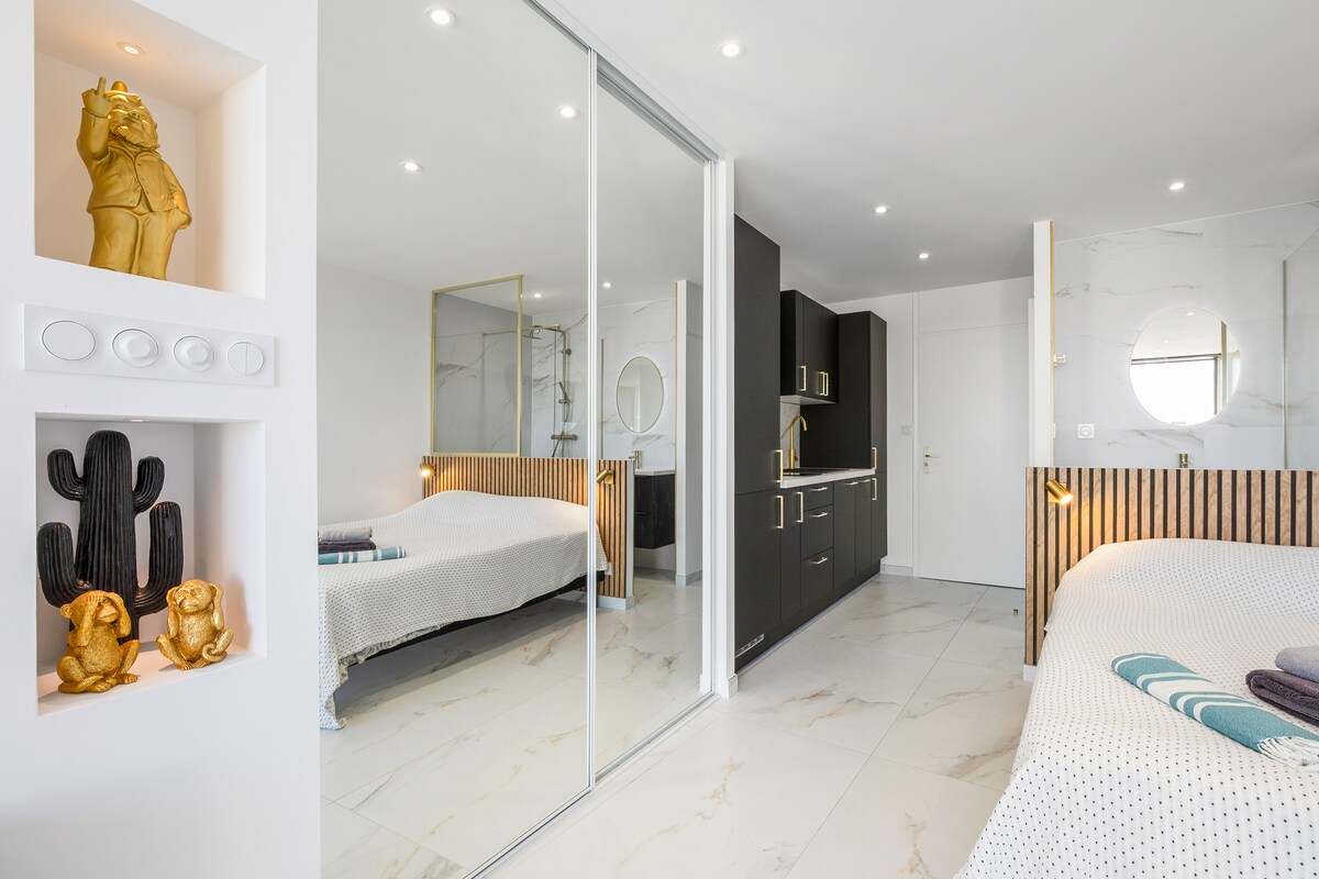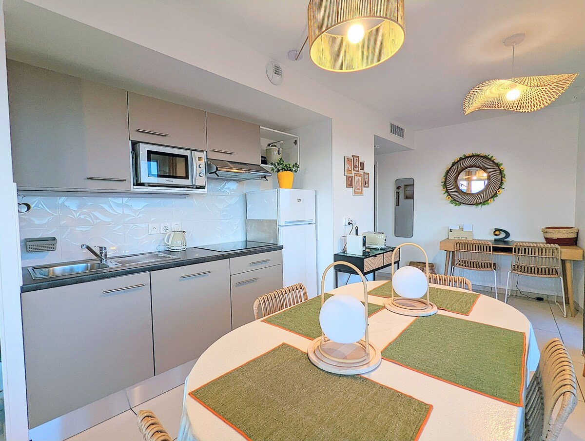 RENOVACIÓN COMPLETA 23 Increíbles vistas al mar y a la playa... Desde la terraza de madera, puedes desayunar al amanecer frente al mar, echar una siesta en el sofá o tomar un aperitivo y disfrutar del atardecer. Situado en el tercer piso (con ascensor) de la residencia Héliopolis, este estudio está totalmente equipado (aire acondicionado, cama de 160 x 200, mucho almacenamiento, baño, aseo separado, cocina americana). Se proporcionan sábanas y toallas, así como wifi y una plaza de aparcamiento privado.