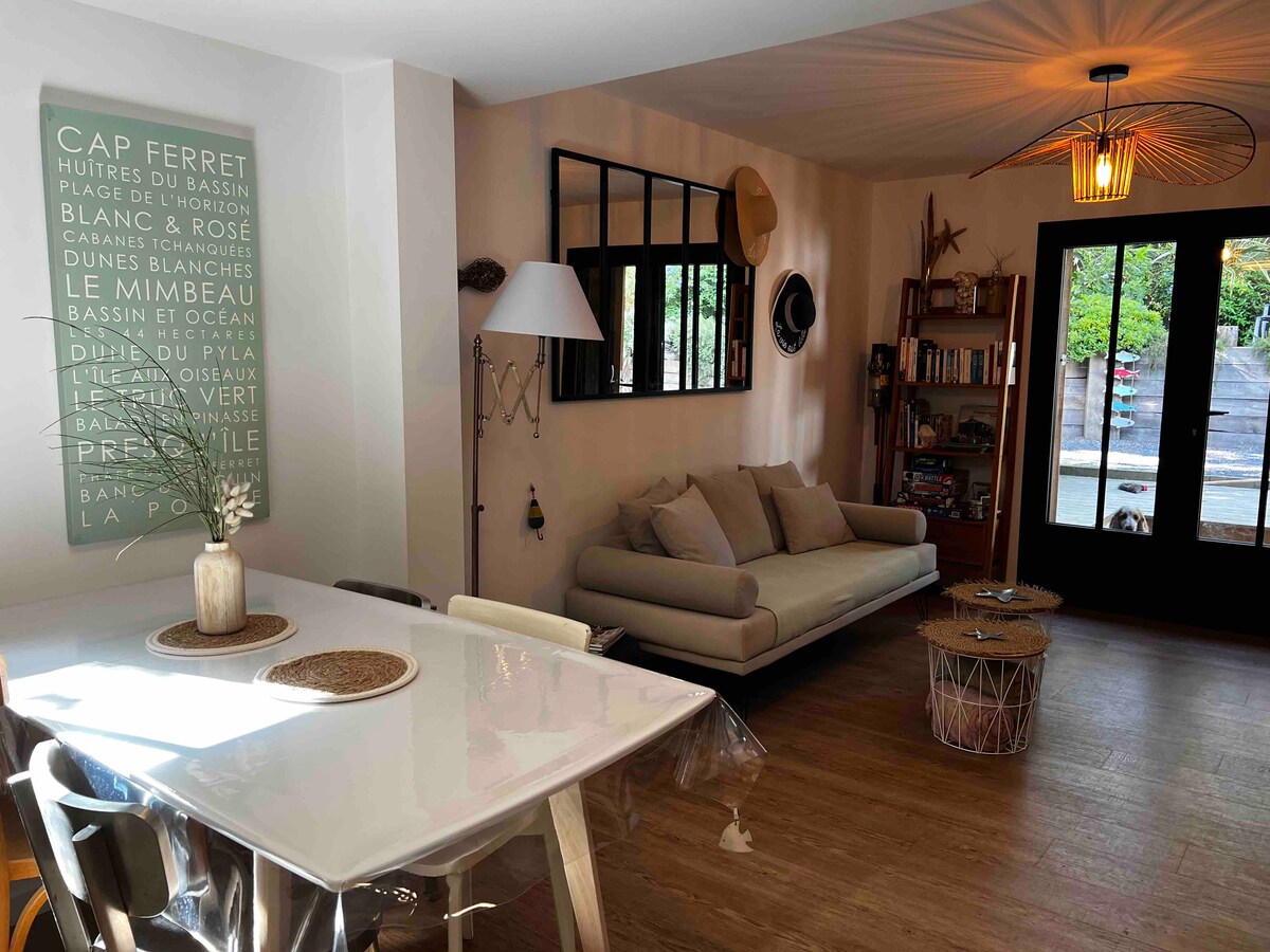VILLA TANTELY - À la pointe du Cap-Ferret (à 5mn à pieds : le Mimbeau, à 10mn : l'océan), cet appartement indépendant en rez-de-chaussée, rénové en 2025, et son grand jardin privatif offrent tout le confort et le calme pour des vacances réussies au milieu des pins et des mimosas.
