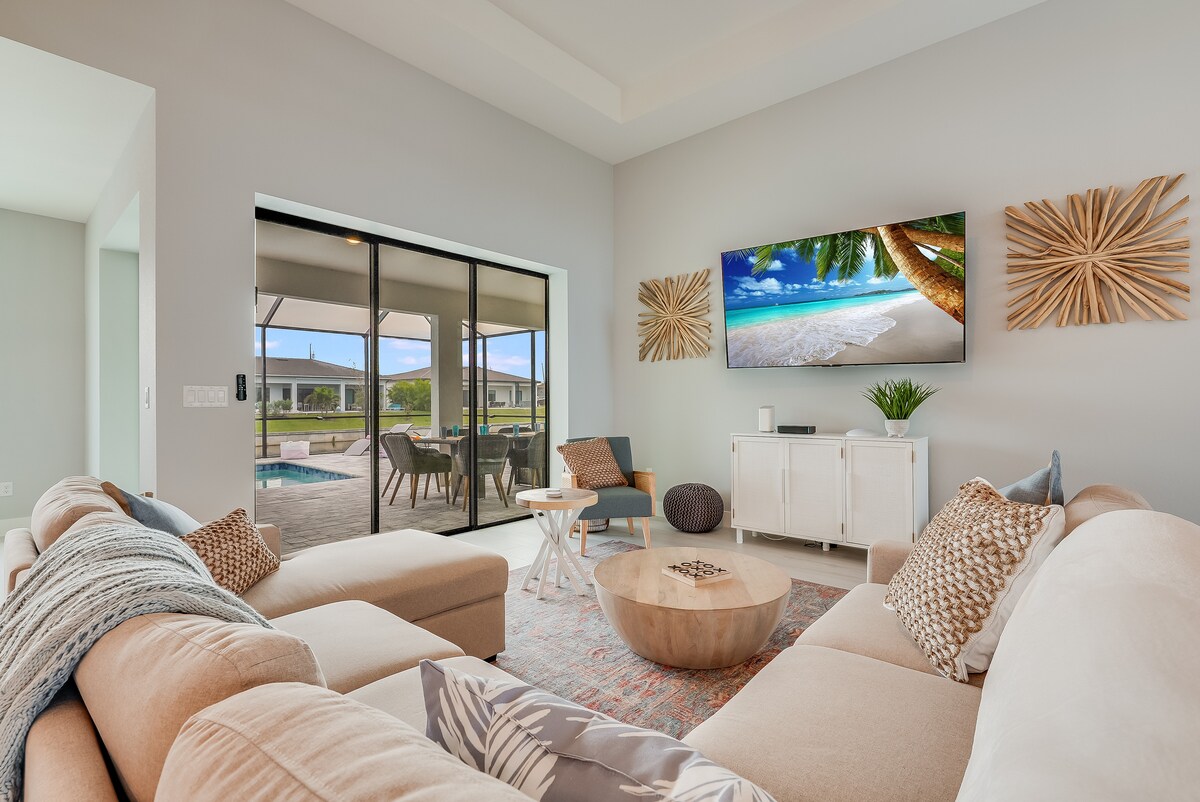 ¡TE DAMOS LA BIENVENIDA! NUEVA CASA DE LUJOSA TEMÁTICA OCEAN BLUE REMODELADA EN PRIMERA Y TRANQUILA UBICACIÓN DE SW CAPE PUEDES CAMINAR O IR EN BICICLETA A CAPE HARBOR YA NO ESTÁ A LA VENTA 3 BR 2 BA GRAN COCINA ABIERTA CON MUCHAS LUCES NATURALES ELECTRODOMÉSTICOS SS, ENCIMERAS DE CUARZO 1 CAMA TAMAÑO KING, 2 REINAS, SOFÁ DOBLE DUCHAS DE LLUVIA CON BAÑERA INDEPENDIENTE DE INMERSIÓN PROFUNDA PISCINA CLIMATIZADA CON PANTALLA climatizada a 85 grados LANAI TRAVERTINO DOS HAMACAS. SUMINISTROS DE CAFÉ KEURIG W K-CUPS FREIDORAS DE AIRE COCINA LENTA PARRILLA WEBBER YouTubeTV INTERNET 3 bicicletas y sillas de playa A 15 MINUTOS A 2 DE LA PLAYA