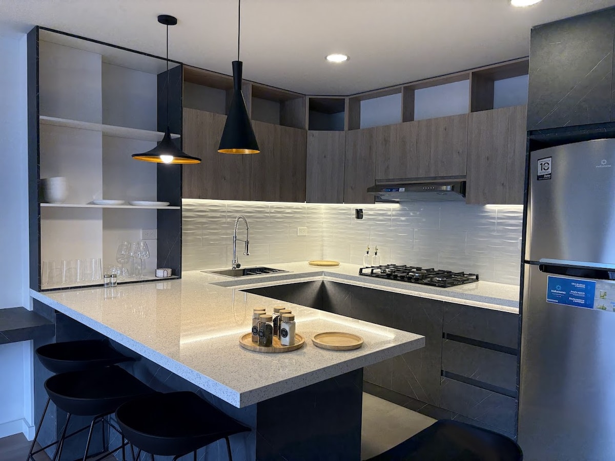 Este elegante alojamiento es ideal para noches de pareja, familia corta o estadías largas de trabajo. Contamos con jacuzzi dentro del departamento, chimenea de bioetanol y una sala con una pantalla de 85” para las mejores noches y experiencias inolvidables de sus vacaciones. Cama tamaño king y hermosos balcones. Cocina propia con todos los implementos necesarios. Cerca de lavanderías, tiendas, restaurantes. Parqueadero propio y cámaras con vista a la calle para su tranquilidad.