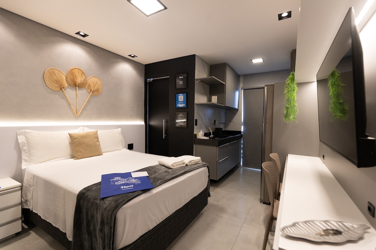 ▪️ Similar a una habitación de hotel; ▪️ Microapartamento solo para ti; ▪️Comodidad y ubicación estratégica; ▪️Excelente costo-beneficio; ▪️ Garaje; ▪️ Wifi; ▪️ Colchón nuevo; ▪️ Ropa de cama y toallas del hotel; ▪️ Cocina completa: cocina eléctrica, minibar, sandwichera, cafetera, batidora, utensilios de cocina de cerámica; Televisión ▪️ inteligente, Sky+, Prime Video; ▪️ Estudio, trabajo, mesa de comedor con sillas cómodas; ▪️ Plancha y secador de pelo; Lavandería ▪️ Omo en el edificio; ▪️ Filtra.