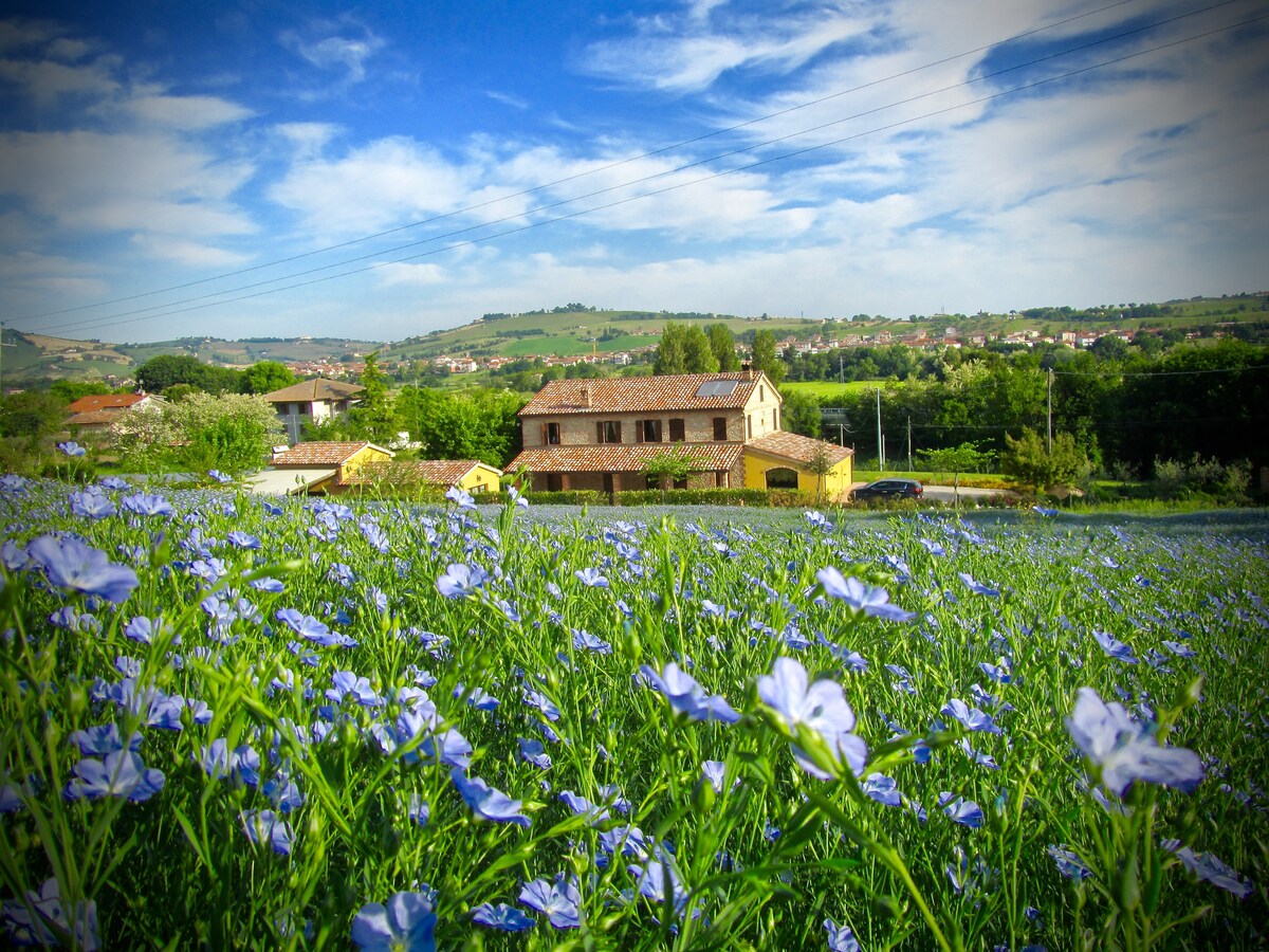 Casa de campo que ofrece momentos de tranquilidad en un ambiente sereno, producimos vino DOC y aceite de oliva virgen extra. Las Marcas están llenas de maravillas que nos regala la Madre Naturaleza: el mar, las montañas, los valles salpicados de ríos, las gargantas y los pasos naturales de los Apeninos, o construidos por la sabiduría de artistas de renombre. Pero las obras creadas por la sencilla mano del agricultor no desfiguran el paisaje que se abre ante tus ojos. «...que el paseo sea ligero para ti, viajero, y el corazón, ligero».