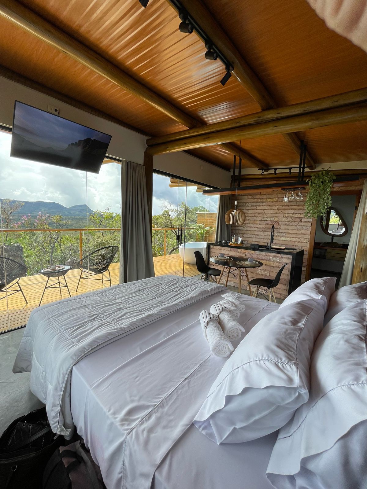 Parte de la romántica Villa Pouso Alto, la Gruta tiene un espacio muy grande (100 m2 de área interna + balcón) y cómodo para una pareja con una vista única de las montañas. Su arquitectura mezcla la rústica de la chapada con la sofisticación y la modernidad, lo que hace que la estancia sea muy agradable y con gran comodidad. Tiene hidroeléctrica, cubierta cubierta, aire acondicionado, TV de 65pulgadas, torre de sonido, piscina climatizada compartida con vistas encantadoras. * DESAYUNO OPCIONAL pagado por separado. PROGRAMA en la reservación