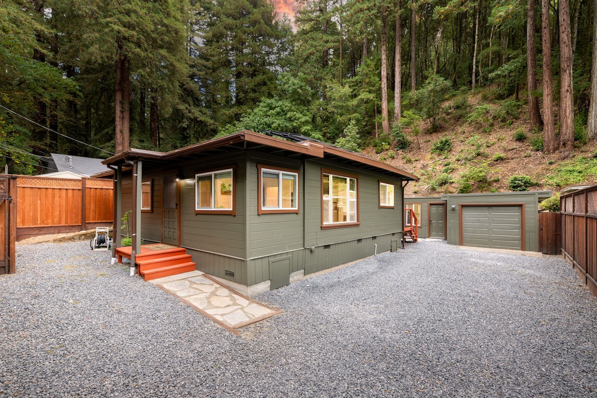 Ubicada entre las secuoyas de Cazadero, Gravenstein Cottage se encuentra en el oasis de Elim Grove, en los terrenos de la galardonada Raymond's Bakery, el lugar perfecto para relajarse y disfrutar del condado de Sonoma. Desconecta del estrés de la vida cotidiana en un cómodo sofá antiguo de seis pies junto a una estufa de leña real. O refréscate con una ducha caliente bajo el tragaluz del baño. Relájate en la cama tamaño queen mientras observas las hojas doradas y variadas de bambú mecerse suavemente con la brisa fuera de tu ventana.