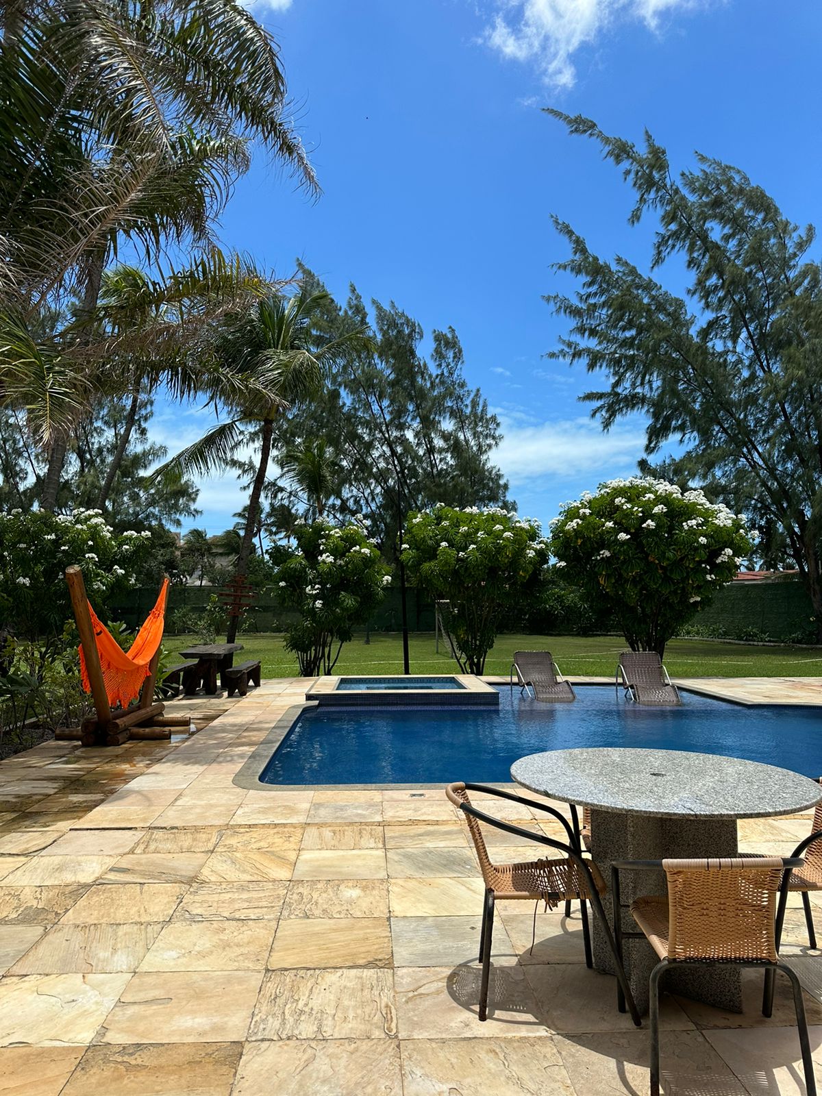 Relájate con toda la familia en este alojamiento tranquilo. Cuenta con 4 dormitorios, 2 de ellos suites (todos con aire acondicionado), cocina equipada, sala de estar con TV, wifi, piscina y terraza con barbacoa. Situado en la playa de Guajiru, en la calle principal, a 500 metros de la playa. Cerca de las playas de Flecheiras y Mundau. Cerca de tiendas, restaurantes y farmacia.