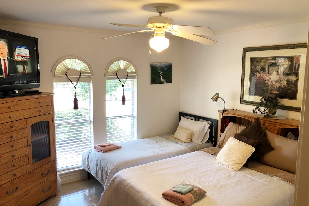 La decoración te transportará a mediados de los años70. ¡Hemos pensado en todos los detalles para que tu estancia sea lo más cómoda posible! Entrada independiente para mayor privacidad y su propio espacio de estacionamiento. Incluye cocina, lavadora/secadora, baño privado con cama tamaño queen y vestidor. Se incluye una sala de estar privada donde un tercer/cuarto huésped puede dormir en un colchón de aire queen. Ubicación céntrica entre el aeropuerto de DFW y Love Field. Cerca de Cedar Hill Park, AA Center, ATT Stadium, Globe Field. A 30 minutos de FW. A una hora de Waco