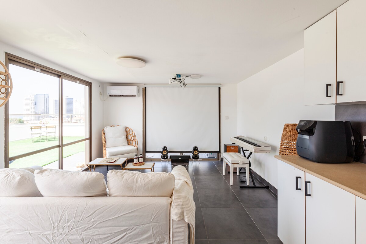 This two-bedroom, two-bath penthouse is in the heart of Tel Aviv, steps from the TLV Port and Hilton Beach, above the city's best restaurants, cafés, gyms, and spas. Designed by Israeli designer Noa Benadi, it features hotel-style finishes and premium mattresses for a perfect night’s sleep. Enjoy a private rooftop with tanning beds, a lounge set, BBQ, and an outdoor cinema setup with a projector — ideal for relaxing or entertaining.