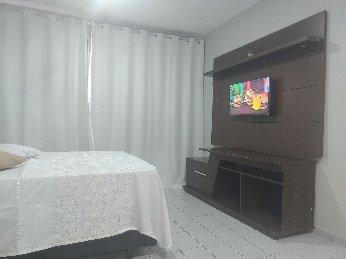Si buscas un lugar funcional y acogedor, ¡este apartamento te sorprenderá! ¡Excelente velocidad Wi-Fi, aire acondicionado en los dormitorios y sala de estar! Dos dormitorios, uno con una cama tamaño queen, el otro con 2 camas individuales, una mesita de noche móvil (que permite retirarla si es necesario unir las dos camas) y armarios planificados. Villa con sillas cómodas, cafetera, cocina con todos los utensilios necesarios para preparar tus comidas. Lavadora y tanque. ¡Relájate y siéntete en casa!
