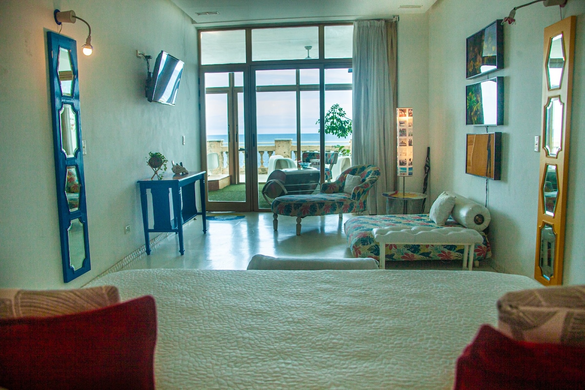 Este lugar es único por su vista al mar desde cada parte de la habitación. Un estilo único destacando la cubania. Terraza privada con vista sobre el Malecón Habanero. Tiene una tina con vista al mar. Hall amplio donde puede compartir con amigos o familia. Total privacidad e independencia del resto de las áreas de la casa.