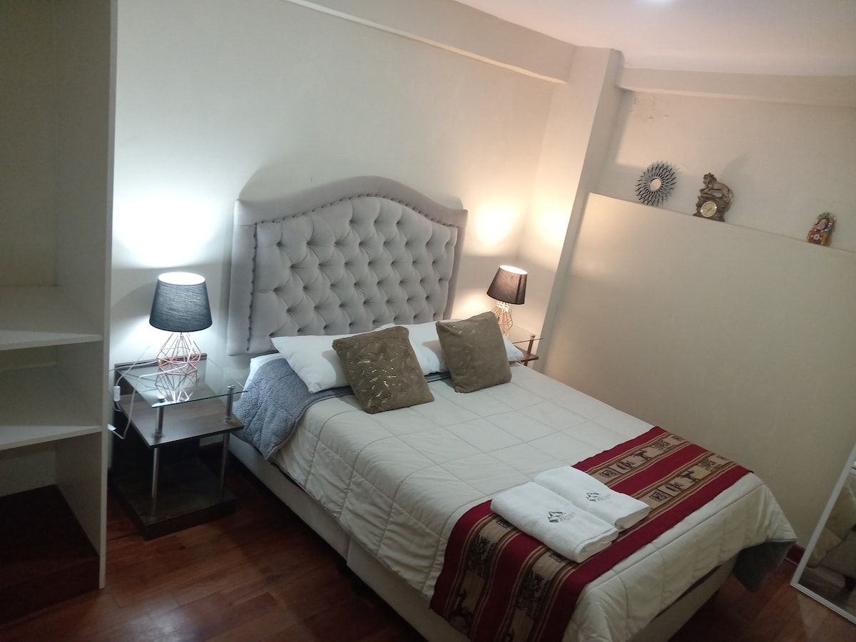 Departamento acogedor e independiente con una habitación, espacio de trabajo, kitchenette, lavandería y un baño, ubicada en centro histórico, a solo tres cuadras de la plaza de armas, incluye todos los servicios, cerca a muchos restaurantes, lugares de entretenimiento, centros artesanales y sitios arqueológicos.