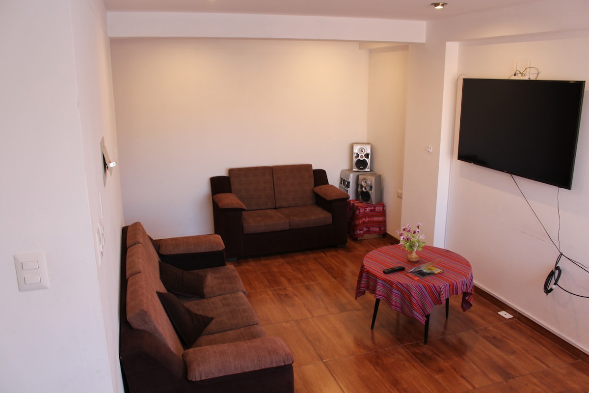 Acogedor mini departamento completamente amoblado,excelente ubicación, a 5 minutos de la plaza de armas, cuenta con un cuarto amplio, una sala comedor, un baño, una cocina equipada y una terraza. Niños menores de 5 años no pagan. Nosotros vivimos al costado para cualquier cosa que puedan necesitar, por esto mismo a veces se puede escuchar a nuestros perritos ladrar, esto solo sucede eventualmente y no durante las noches. No contamos con calefaccion instalada pero tenemos un calefactor grande para alquilar, el costo es de 10 soles la noche.